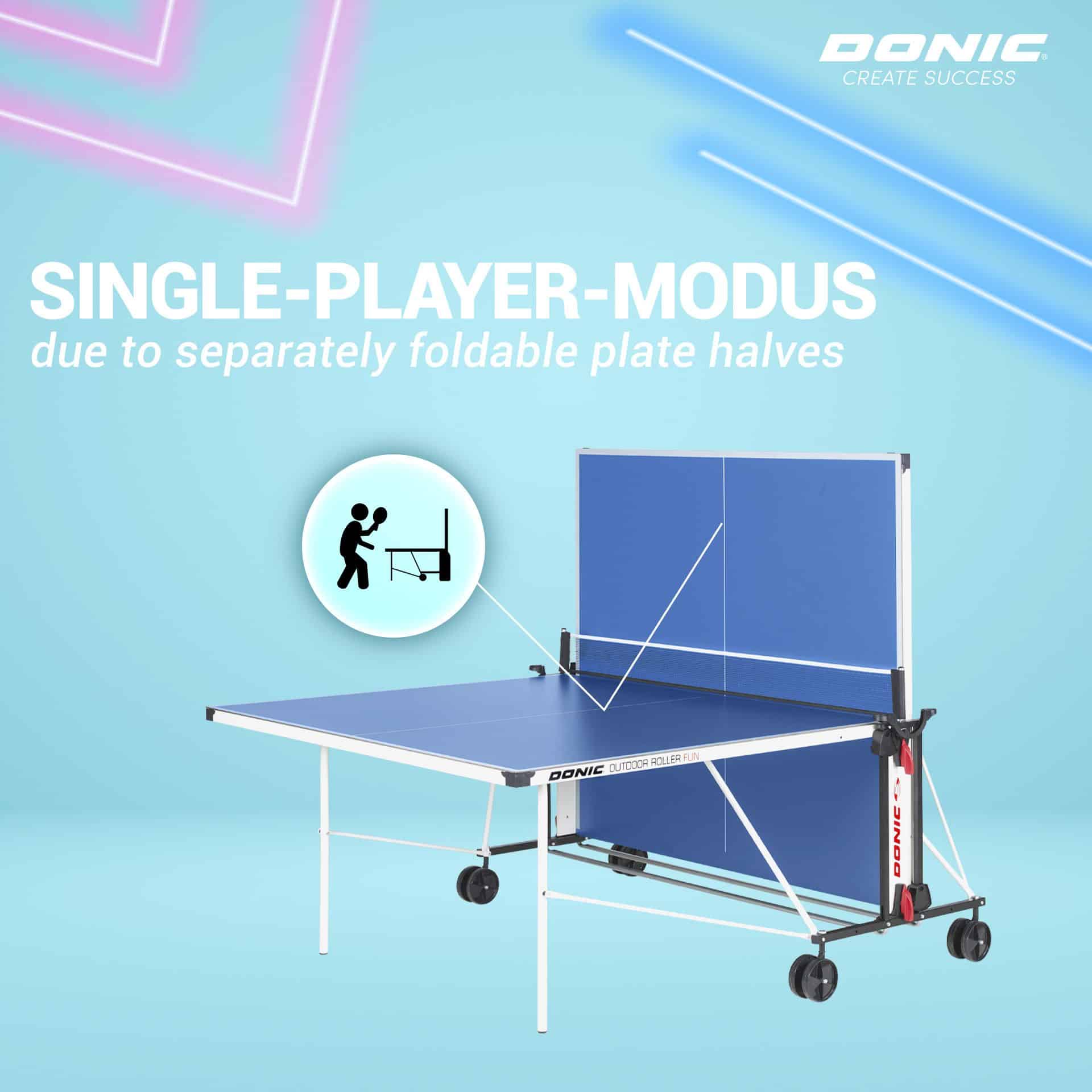 שולחן DONIC Outdoor ROLLER FUN מיועד למשפחות, חובבים ומוסדות פנאי המחפשים שולחן טניס איכותי, עמיד ונייד לשימוש חיצוני – בגינה, במרפסת או במתחם ספורט פתוח. מתאים למשחק זוגי או לאימון עצמי באמצעות מצב playback.