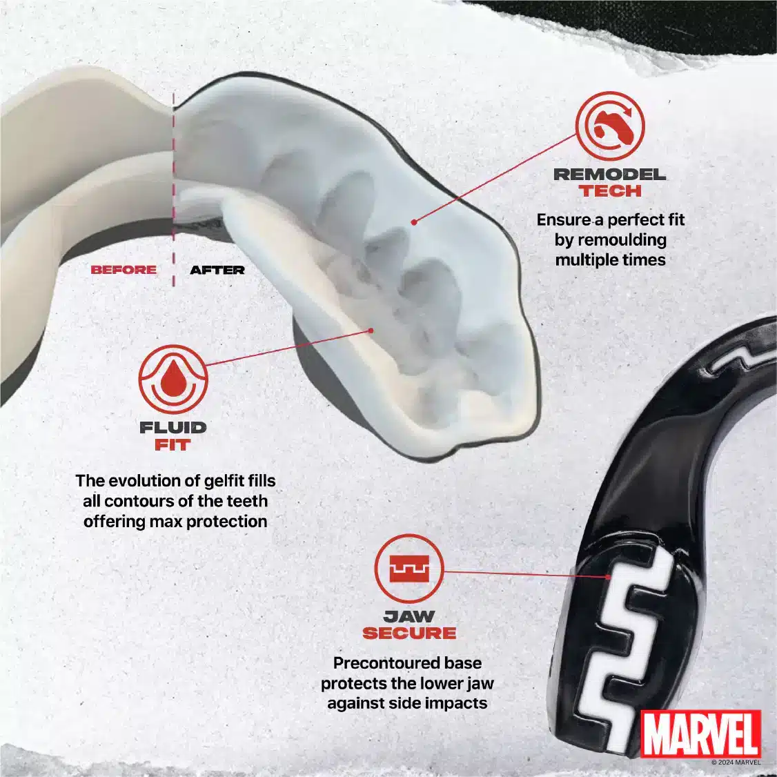 מגן שיניים לילדים ולמבוגרים מסדרת מארוול מבית Safejawz, מיוצר בטכנולוגיית Dual-Layer לבלימת זעזועים ועם שכבת ג'ל פנימית המבטיחה הצמדה מושלמת לשיניים. טכנולוגיית Fluid-Fit מאפשרת התאמה מלאה למבנה הפה, כך שהמגן נשאר יציב גם במהלך האימונים האינטנסיביים ביותר. מערכת Jaw-Secure הייחודית של Safejawz מגנה גם על השיניים התחתונות, על אף שמדובר במגן יחיד. בזכות העיצוב התחתון, השיניים "ננעלות" בתוך המגן לקבלת יציבות נוספת והגנה על הלסת.