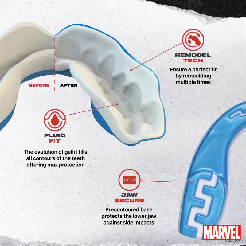 מגן שיניים לילדים ומבוגרים מסדרת מארוול מבית Safejawz, מיוצר בטכנולוגיית Dual-Layer לבלימת זעזועים ועם שכבת ג'ל פנימית המבטיחה הצמדה מושלמת לשיניים. טכנולוגיית Fluid-Fit מאפשרת התאמה מלאה למבנה הפה, כך שהמגן נשאר יציב גם במהלך האימונים האינטנסיביים ביותר. מערכת Jaw-Secure הייחודית של Safejawz מגנה גם על השיניים התחתונות, על אף שמדובר במגן יחיד. בזכות העיצוב התחתון, השיניים "ננעלות" בתוך המגן לקבלת יציבות נוספת והגנה על הלסת.
