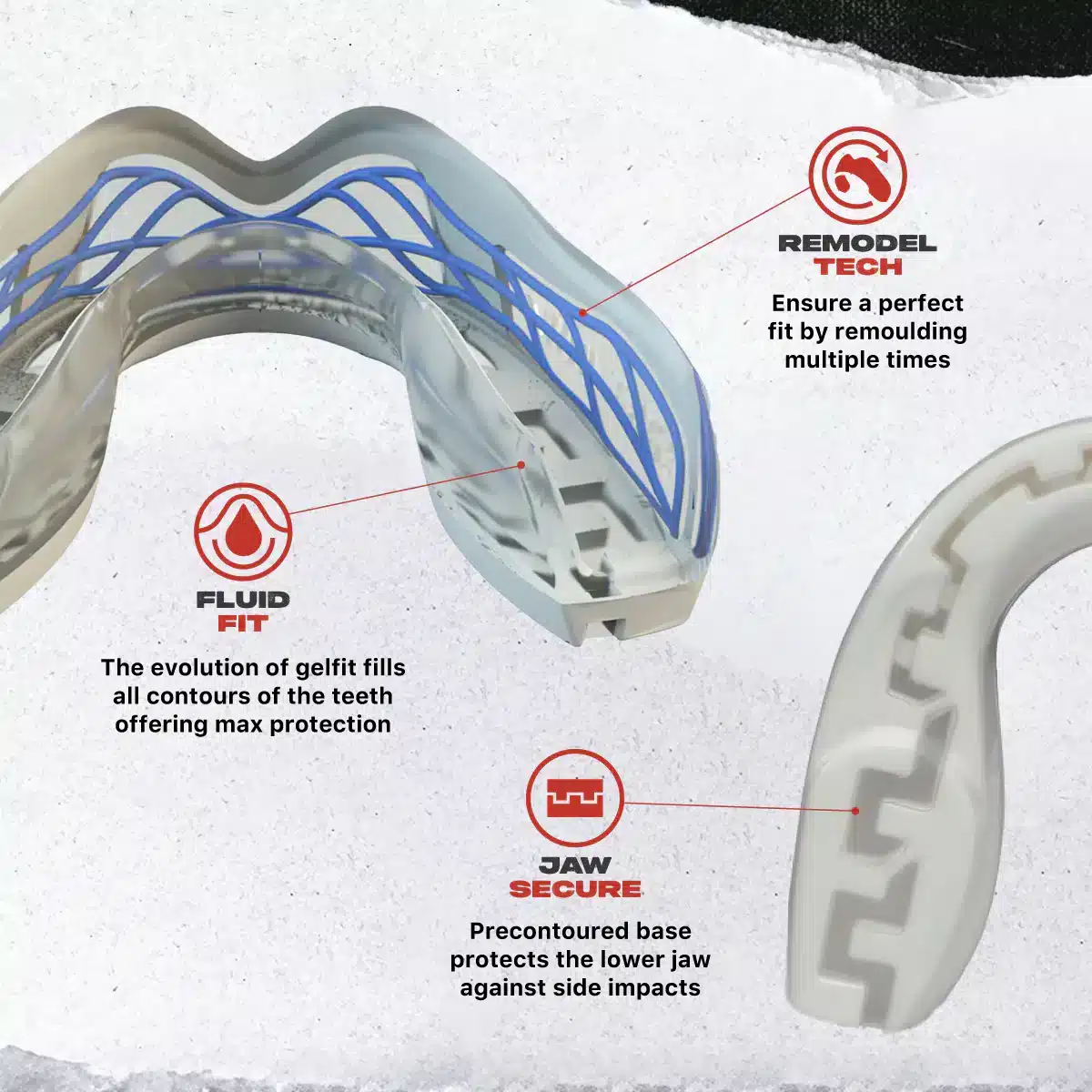 מסגרת ה-Shockcage יוצרת חוזק ויציבות נוספים, Fluid-Fit מאפשרת למגן להיצמד באופן מלא לשיניים, וטכנולוגיית Jaw-Secure מספקת הגנה על השיניים התחתונות, גם כשמדובר במגן יחיד. במאצעות טכנולוגיית Remodel Tech, ניתן לעצב את המגן מחדש עד שלוש פעמים במקרה של אי-נוחות, והוא דק במיוחד כדי למנוע תחושת הקאה.