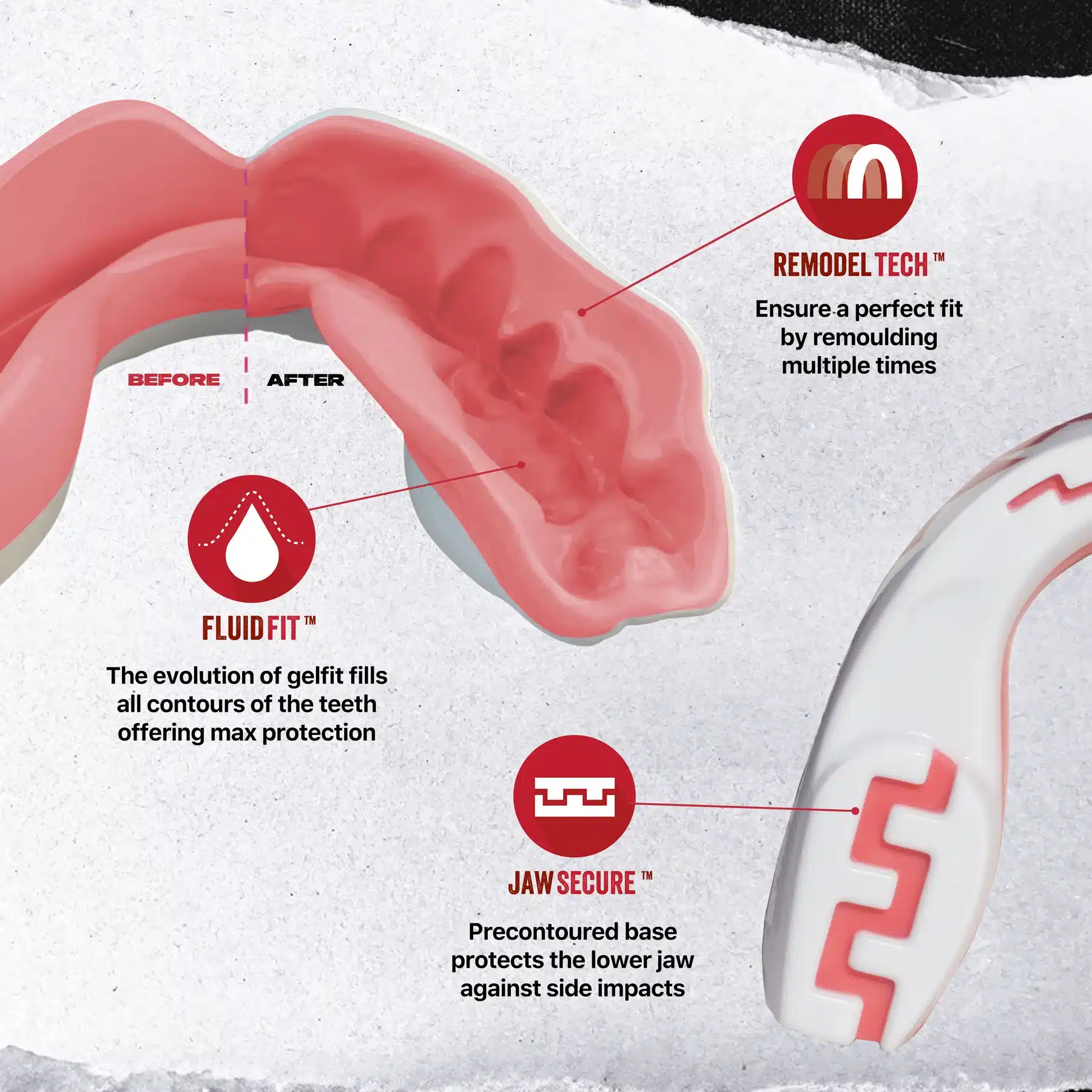 - ✔️ עיצוב Jaw-Secure שמגן גם על השיניים התחתונות.