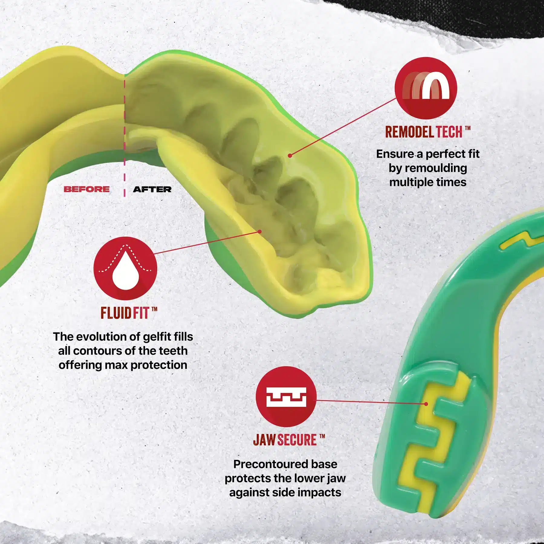 מגן שיניים לילדים Safejawz 'Ogre' מסדרת Extro מביא שילוב של עיצוב ייחודי, נוחות מקסימלית והגנה מתקדמת. המגן מיוצר בטכנולוגיית Dual-Layer לבלימת זעזועים ועם שכבת ג'ל פנימית המבטיחה הצמדה מושלמת לשיניים. טכנולוגיית Fluid-Fit מאפשרת התאמה מלאה למבנה הפה, כך שהמגן נשאר יציב גם במהלך האימונים האינטנסיביים ביותר.
